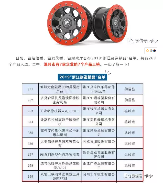 為全面提升“浙江制造”品牌形象,深入推進(jìn)實(shí)施“四換三名”工程,推動(dòng)企業(yè)提升創(chuàng)新能力、品牌培育和市場(chǎng)開拓力度,扶持并推廣應(yīng)用一批“技術(shù)先進(jìn)、設(shè)計(jì)新穎、質(zhì)量可靠、效益優(yōu)良”的浙江制造產(chǎn)品,公司響應(yīng)風(fēng)馳于2019響應(yīng)政府號(hào)召積極參與“浙江制造精品”申報(bào),通過(guò)省經(jīng)信委、省發(fā)改委、省財(cái)經(jīng)廳聯(lián)合開展評(píng)選,風(fēng)馳的《高強(qiáng)度輕量化滾壓式全地形車鋼圈》上榜入選為2019“浙江制造精品”名單,同時(shí)根據(jù)市政府鼓勵(lì)企業(yè)開發(fā)新產(chǎn)品的規(guī)定,公司將予以獲得30萬(wàn)元的獎(jiǎng)勵(lì)。