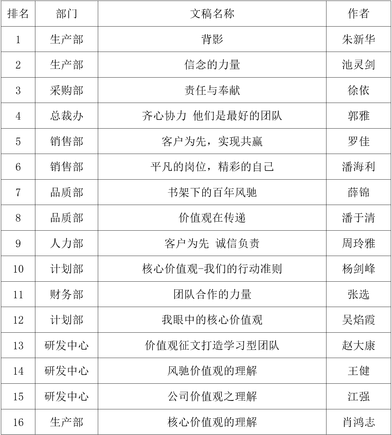 首先,評審組10位評委根據(jù)價值觀主題、文稿內容,觀點表達清晰度,事實案例,語言表達流暢,文稿整體結構完整性,幾個方面對稿件進行了認真的打分,再依據(jù)分值排名匯總至執(zhí)行總裁最終審核,得出最終評審結果:生產部朱新華的《背影》一文一舉奪魁,文中沒有華麗的文字,沒有網紅的心靈雞湯,只是簡單的言語,背后卻道出了我們公司的價值觀,平凡崗位上忙碌的背影深深印刻在每位風馳人的心中,文章獲得評委們的一致好評。生產部池靈劍的《信念的力量》立場鮮明,主題突出,讓人感到信念的是一種熱烈的,一種噴薄而出,一種昂揚斗志的力量,喜獲二等獎;采購部徐依的《責任與豐獻》,總裁辦郭雅的《齊心協(xié)力,他們是最好的團隊》并列三等獎。