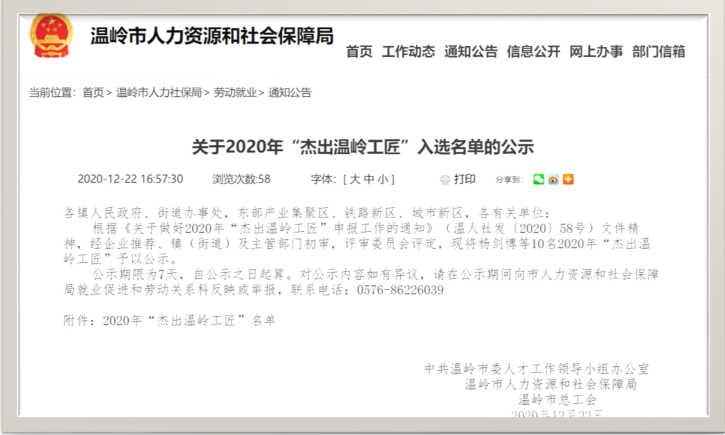根據(jù)《關(guān)于做好2020年“杰出溫嶺工匠”申報工作的通知》(溫人社發(fā)〔2020〕58號)文件精神,我司研發(fā)中心工程平臺車工技師莫朝陽符合申報要求,通過公司推薦,主管部門初審,評審委員會評定,順利通過被評定為“杰出溫嶺工匠”