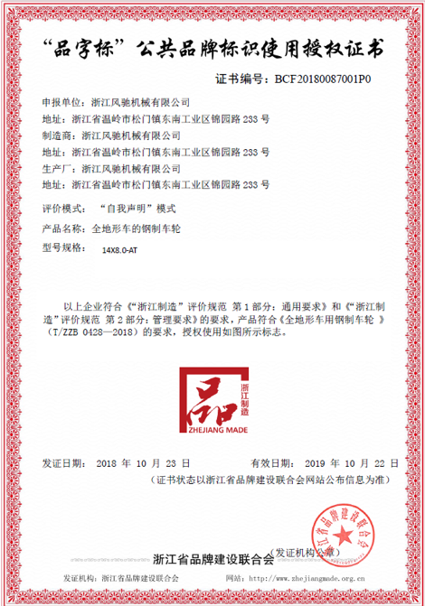 我司是在去年積極響應(yīng)浙江制造品牌建設(shè),在完成上一階段浙江制造團體標準《全地形車用鋼制車輪》(T/ZZB 0428-2018)的申報、審批與發(fā)布實施后,在此基礎(chǔ)之上,于2018年9月份申報了“品字標公共品牌標識”,通過“自我申明”評價模式及資質(zhì)審核,順利通過評審,獲得了“品字標”公共品牌標識使用證書。